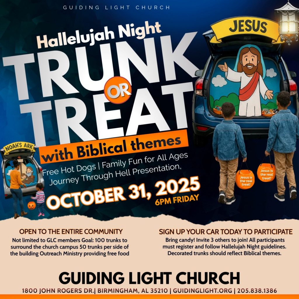 Guiding Light Church will host its annual Hallelujah Night on Thursday, October 31, 2025, providing a safe and family-friendly alternative to Halloween. The event will feature more than 100 decorated trunks filled with candy, food trucks, music, games, and an impactful gospel message. Families will have the opportunity to experience the “Journey Through Hell” presentation, a dramatic walk-through that highlights the dangers of sin, followed by the “Heavenly Hope Salvation Station,” where the message of Christ’s love and redemption will be shared. Hallelujah Night is open to the entire community and designed to bring families together for fun, fellowship, and faith. For more information or to participate, contact Guiding Light Church at 205-838-1386 to speak with Elder Letangelon or Pastor ALowe.
