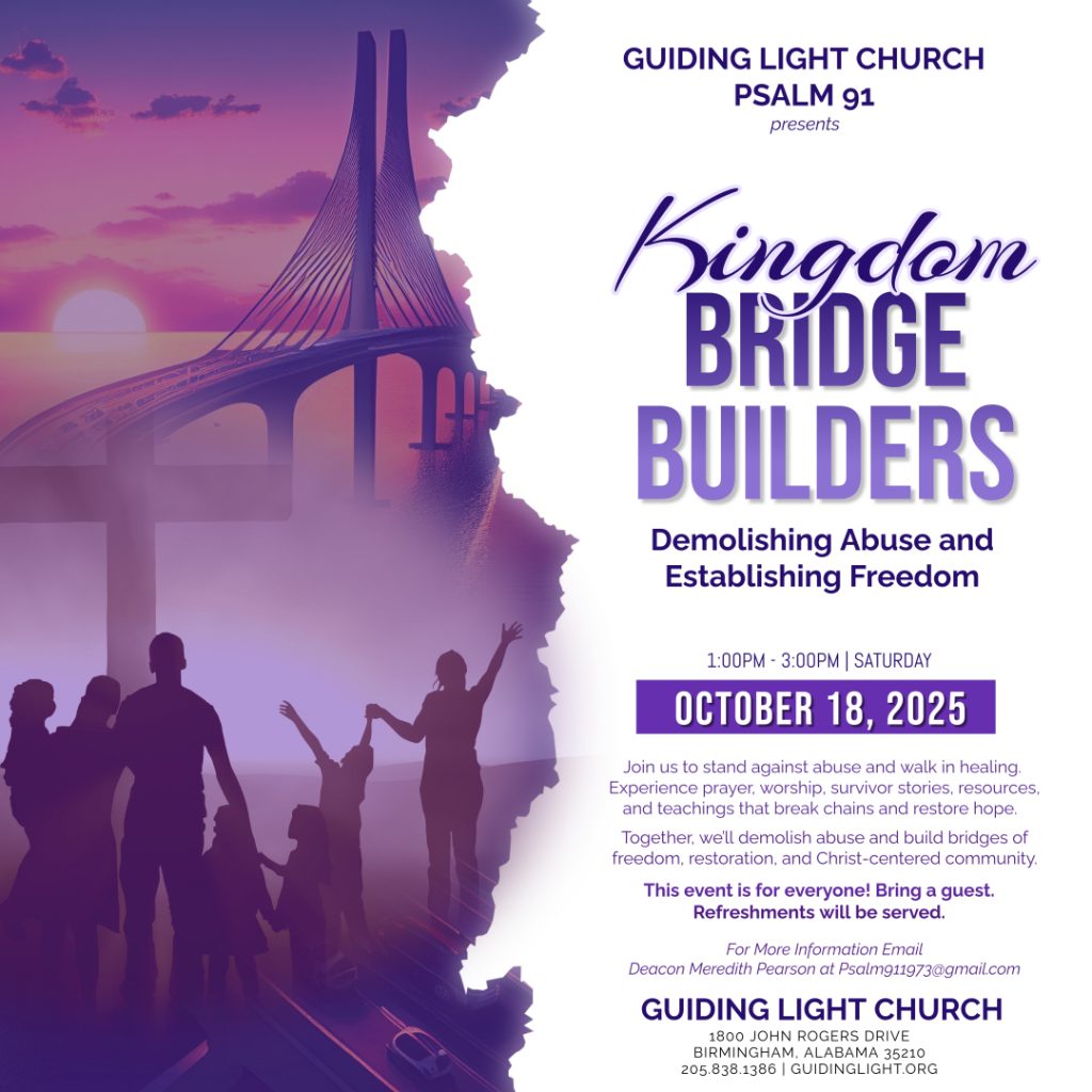 This event is for EVERYONE! We all have gifts and talents we can contribute to this cause. On October 18,2025 at 1:00 pm, we will have a gathering for those who are standing against abuse and will help those seeking healing and freedom from the effects of abuse. We will have prayer and worship, survivor testimonials, local and national resources, and ministry and teachings about fighting the spirit of abuse and walking in the freedom and restoration of Christ Jesus. Come join us and invite someone . Together we will demolish abuse and build bridges of hope, encouragement, freedom and restoration within our communities! Please connect with Deacon Meredith Pearson if you would like to participate or need further information. Psalm911973@gmail.com